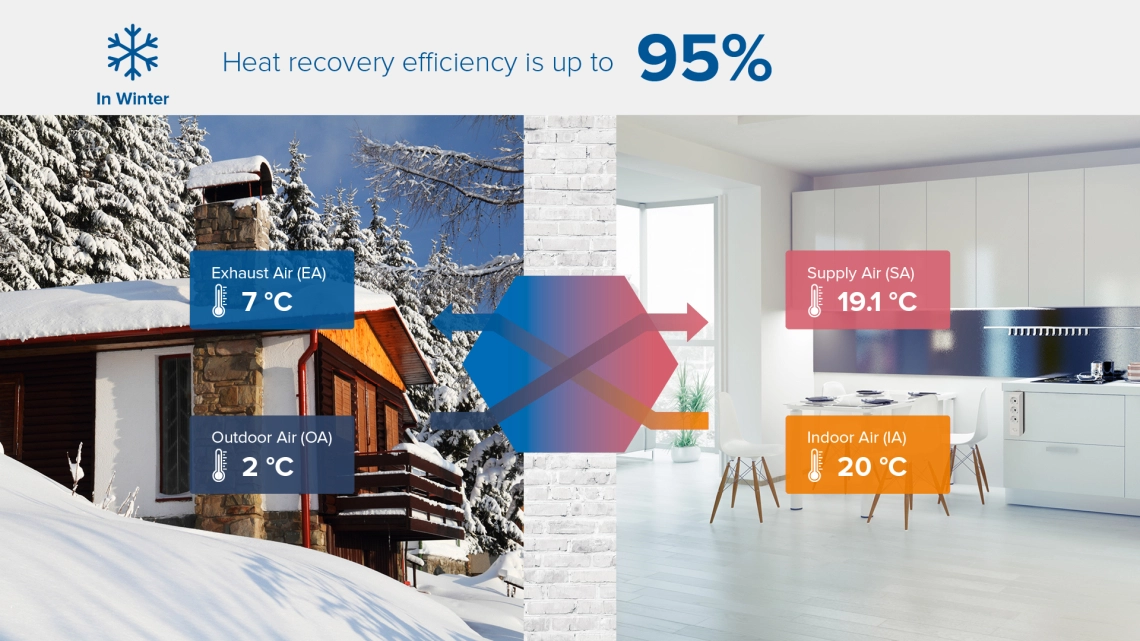 Im Winter wird ein Teil der Innenraumwärme in den Raum zurückgeführt, was erhebliche Einsparungen bei der Raum- und Lufterwärmung ermöglicht.